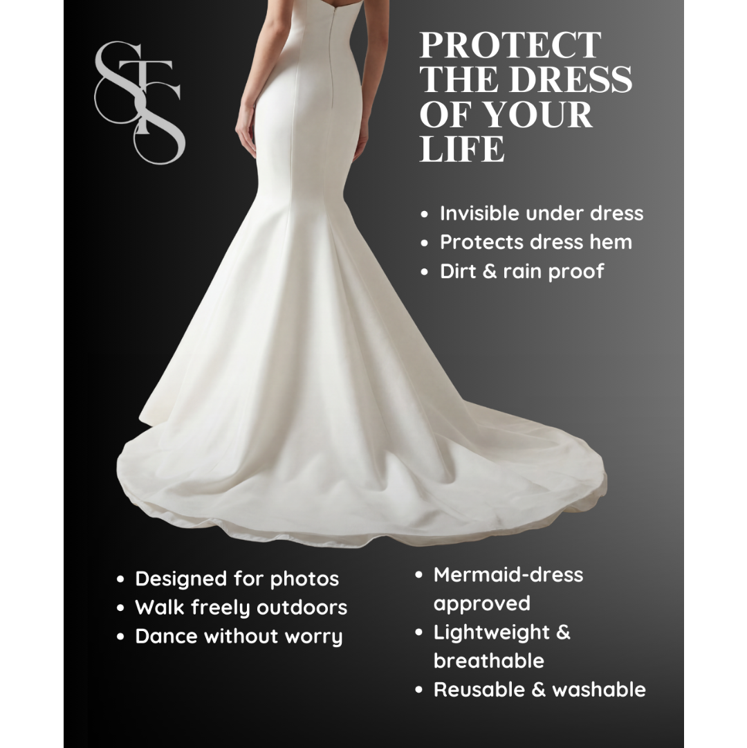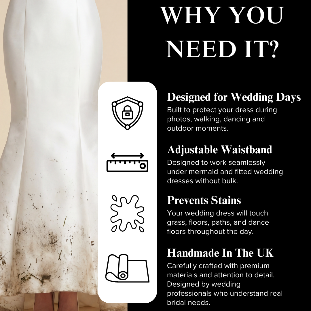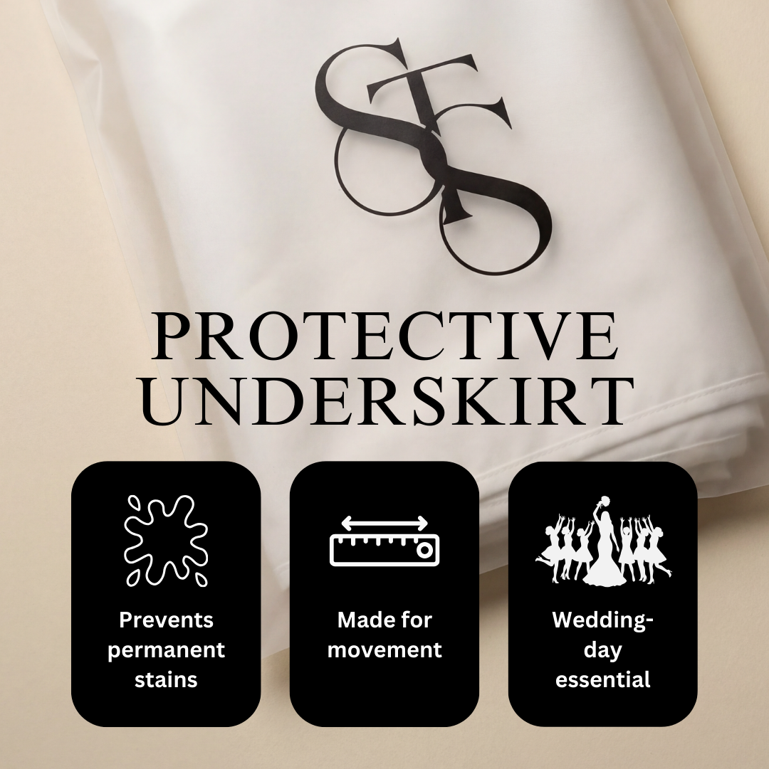 Your wedding day is full of movement—walking, posing, dancing and capturing memories from every angle. The Salvage The Slay protective underskirt sits discreetly beneath your dress, shielding the hem from dirt, damp ground and sticky floors while remaining completely invisible in photos and film.